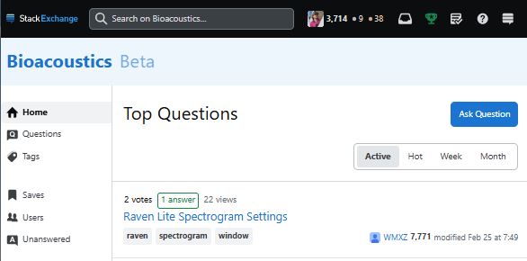 Stack Exchange is a crowd-sourced Question & Answer site where information is archived and publicly accessible. In 2022 I led an effort to develop a Bioacoustics Stack Exchange site to provide a place for people to share information and empower scientists and practitioners from underserved communities to use good science. The proposal process required several months of dedication and required global outreach to scientists in the field of bioacoustics.