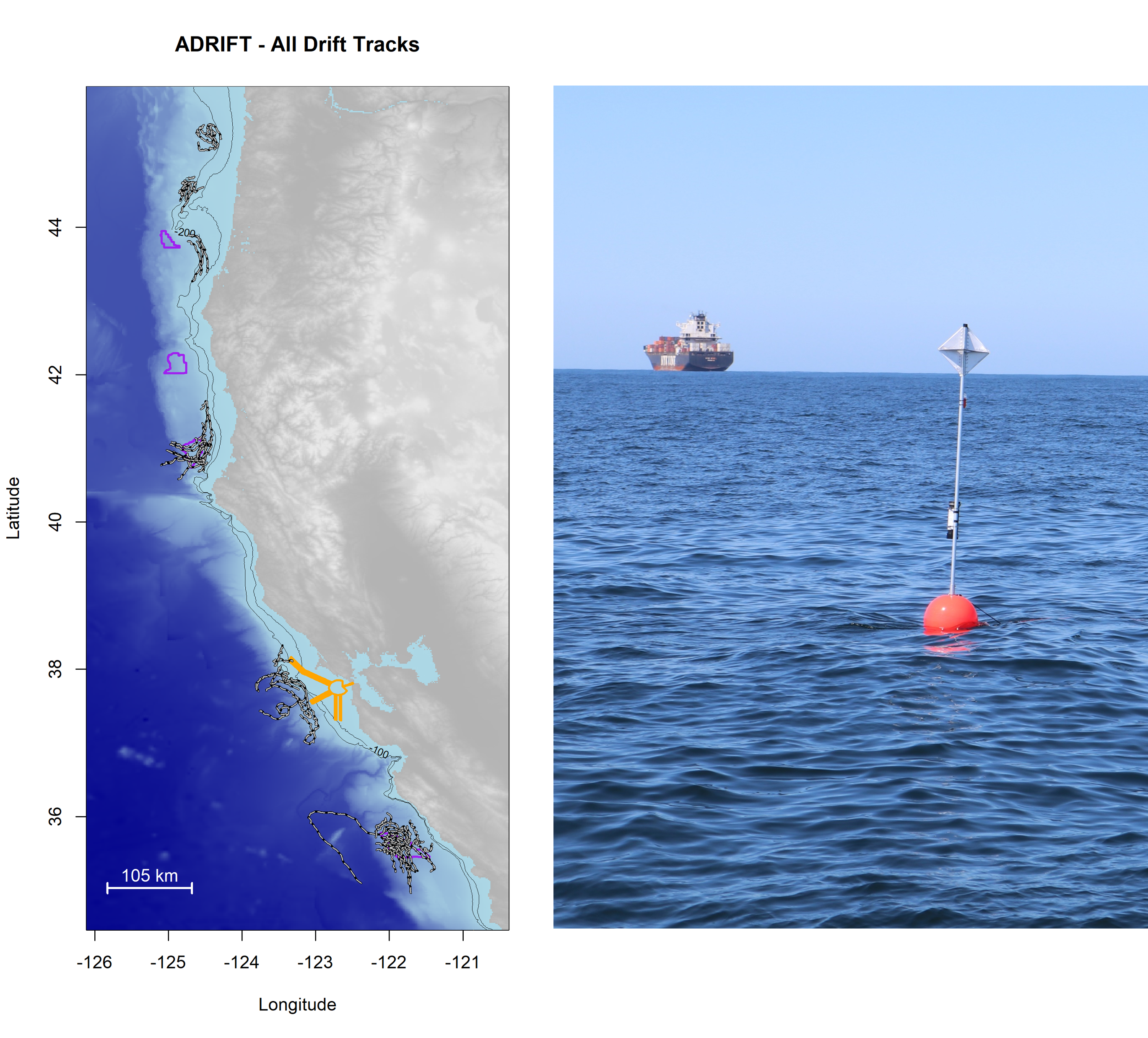 The ADRIFT in the California Current Project (‘Adrift’) used drifting acoustic recorders deployed offshore the U.S. West Coast, combined with more complete analysis of archived data from previous drifting acoustic recorder surveys, to assess the distribution of marine mammals and to characterize the marine soundscape. This study was funded, in part, by the U.S. Department of the Interior, Bureau of Ocean Energy Management (BOEM), Environmental Studies Program, Washington, DC, through Interagency Agreement Number G14M20PG00013 with the Southwest Fisheries Science Center.